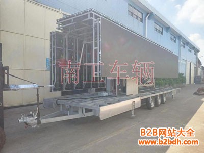 1、拖车外形尺寸长10.6米,宽2.6米,高3.3米。底盘四周采用铝合金包边,顶部设计折叠雨棚,整车不含显示屏自重控制在3.5吨以内。