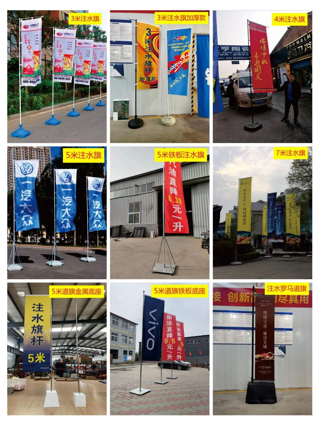 有3米、5米、7米3种高度。底座可轻松更换放置地点,配合可随风旋转的回旋头,可抗七级大风而不倒。 使用便捷 旗杆高度可随意调节,横杆高度可随旗面大小调节,方便拆卸、更换。 注水旗美观耐用,旗杆长度缩放自如,塑料注水式底座携带方便,安放更稳定。