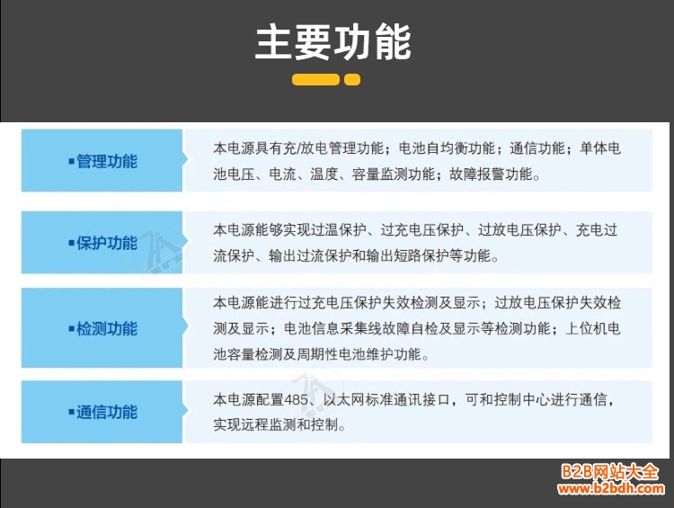 矿用隔爆兼本安型锂离子蓄电池电源,按用途分类为:监测通信系统用后备电源,是我公司专门针对煤矿需求研发的新一代电源类产品。本电源为智能化工作,集锂离子蓄电池、BMS 电池管理系统、电源输入单元、输出单元、绝缘监视、电源转换模块和本安模块为一体,具备对锂离子蓄电池的实时管理、检测及参数显示等功能;具备对电源中蓄电池故障进行监测和报警功能,具备全中文液晶显示功能。本电源通过以太网标准通讯接口,可和控制中心进行通信,实现远程监测和控制。主要用途及适用范围本电源适用于煤矿井下,可作为监测通信系统、监控系统、井下通信照明系统、井下供电控制系统、井下语音广播通信系统、井下应急通信、井下各类传感器等需要 AC127V、AC220V、DC72V、DC48V、DC24V、本安 DC24V、本安 DC18V、本安 DC12V 不间断供电的场合。