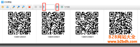 5. 制作完成之后,点击软件顶部的“打印”按钮,在打开的窗口中根据需要设置数据量(这里设置为1000),开始页码为1,点击结束页码后面的“尾页”,然后点击下面的“预览”按钮,翻页查看批量生成的跳号流水号二维码,预览无误就可以直接连接打印机打印出来或者批量输出PDF文档了。
